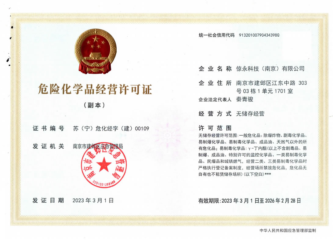 危险化学品经营许可证/证书编号:苏(宁)危化经字(建)00109